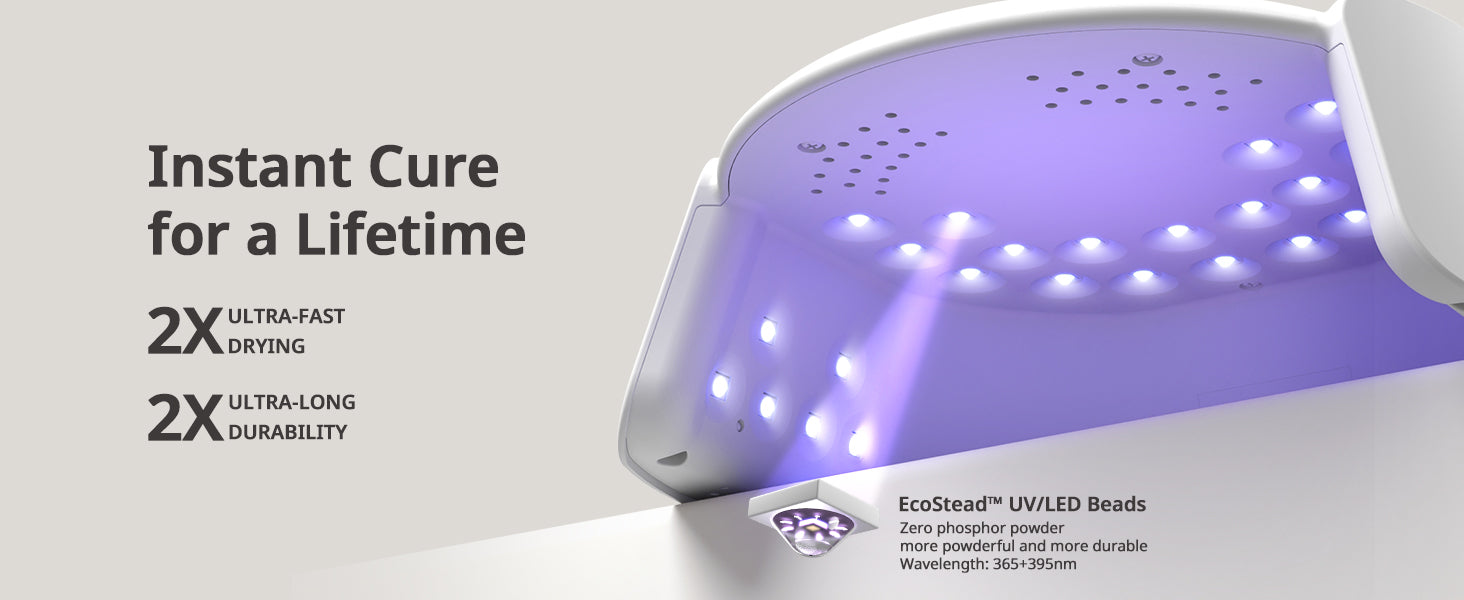 Thanks to the advanced Ecostead UV LED beads, most gel polishes cure in 30–60 seconds. For thin coats, the 10-second setting may be enough, while thicker layers may require 60–90 seconds.